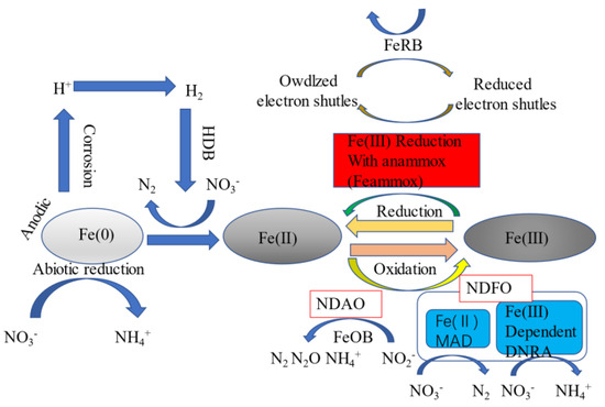 - Peng, Y.; He, S.; Wu, F. Biochemical processes mediated by iron-based materials in water treatement: Enhancing nitrogen and phosphorus removal in low C/N ratio wastewater. Sci. Total Environ. 2021, 775, 145137. [Google Scholar] [CrossRef]