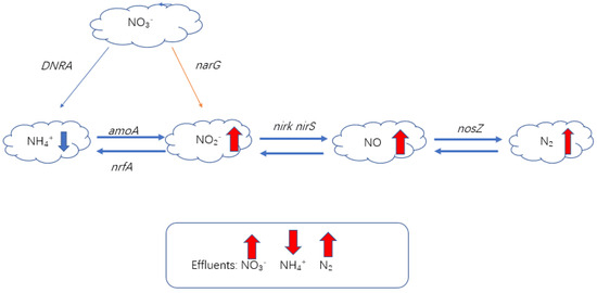 Denitrifying bacteria are a large group, and nitrite reductase genes (nirS and nirk) and nitrous oxide reductase genes (norZ) are commonly used as functional genes to study the denitrification process [60]. Figure 4 is a genetic map of nitrogen removal. The combination of biochar and bacteria showed that the expression of the narG gene was significantly increased. Biochar is an adsorbent of nitrate, and its high porosity and large specific surface area provide conditions for the formation of denitrifying bacteria microbial biofilms, which are mainly reflected in an increase in the nirS gene and the nirK gene abundance. During the operation of CWs, the greenhouse gas CH4 is produced, and the production of CH4 is usually related to the abundance of mcrA genes. The abundance of nirK, nirS, and nosZ genes in modified biochar was found to be significantly higher than that in unmodified biochar. At the same time, the low emission of N2O also confirmed that biochar can induce norZ gene transcription [61]. At a high C/N ratio, the abundance of denitrification functional genes increases significantly [62]. The acidic gene group content of biochar modified with humic acid is higher than that of modified biochar because the acidic group binds to the carbon surface and improves its tensile strength in the π-π interaction during the preparation of active biochar [63].