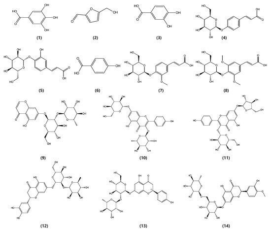 In this study, chromatographic separation of EtOAc and BuOH fractions from Sample 6 of the Drynaria fortunei J. Smith species was performed. The isolated compounds were identified as gallic acid (1) [25], 5-hydroxymethylfurfural (2) [26], protocatechuic acid (3) [27], coumaric acid 4-O-β-D-glucopyranoside (4) [28,29,30], caffeic acid 4-O-β-D-glucopyranoside (5) [31,32,33,34,35], 4-hydroxybenzoic acid (6) [26], lavandoside (7) [29,36], trans-p-sinapoyl-β-D-glucopyranoside (8) [33,36], 5,7-dihydroxychromone-7-O-neohesperidoside (9) [9,31], kaempferol 3-O-rhamnoside 7-O-glucoside (10) [31], kaempferol 3-O-glucopyranoside-7-O-arabinofuranoside (11) [31,37], neoeriocitrin (12) [7], naringin (13) [38], and hesperidin (14) [38] through NMR and MS analyses and comparison with previous research results. The chemical structure of the isolated compound is presented in Figure 1, and the corresponding NMR and MS data are provided in Table S1.