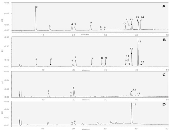 HPLC chromatograms of the (A) standard mixture, (B) D. fortunei extract, (C) D. mollis extract, and (D) D. mariesii extract. 2: compound 2, 3: compound 3, 4: compound 4, 5: compound 5, 7: compound 7, 8: compound 8, 9: compound 9, 10: compound 10, 11: compound 11, 12: compound 12, 13: compound 13, 14: compound 14.