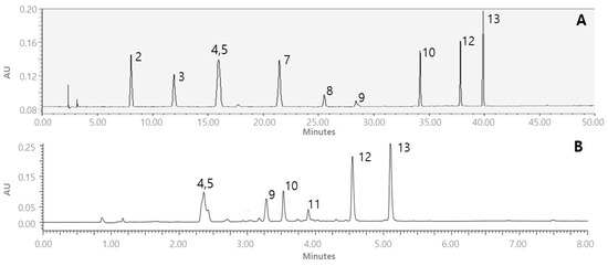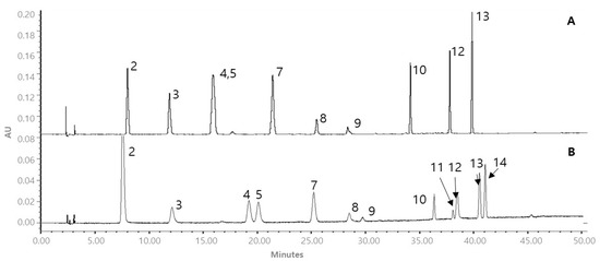 HPLC chromatograms comparing the analysis results of the standard mixture of 12 compounds between the (A) ODS C18 Column and (B) ODS C30 Column. 2: compound 2, 3: compound 3, 4: compound 4, 5: compound 5, 7: compound 7, 8: compound 8, 9: compound 9, 10: compound 10, 11: compound 11, 12: compound 12, 13: compound 13, 14: compound 14.