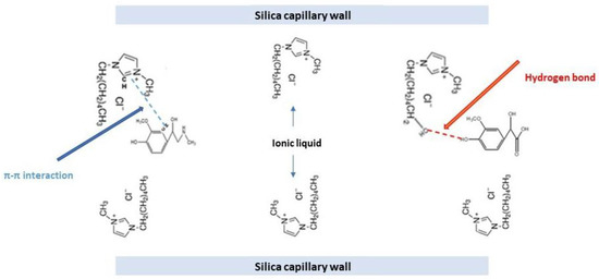 The miscibility of ILs with a wide range of solvents makes them useful in CE as components in the separation buffer and as EOF modifiers due to their good electrical conductivity and slightly more viscous properties compared to organic solvents. In effect, low IL concentrations can be sufficient to significantly improve the electrophoretic separation. It should be highlighted that both the cations and anions of ILs may change the migration behavior of analytes, although the activity of the IL cations has a greater impact on the resolution in CE. In modifying the ionic strength of the BGE, the IL cations are able to change the EOF, which influences the migration times of the analytes and can improve the method’s separation efficiency. In addition, ILs influence the adsorption of IL cations on the capillary’s inner surface, which can reduce, or even reverse, the EOF. Both of the above-mentioned mechanisms improve the resolution of analytes. Thus, imidazolium-based ILs are widely recognized as electrophoretic flow modifiers that facilitate the dynamic modification of the capillary walls, which in turn ensures the stability of the EOF [4]. A diagram depicting the interaction between the examined ILs, the capillary wall, and analytes is shown in Figure 1.