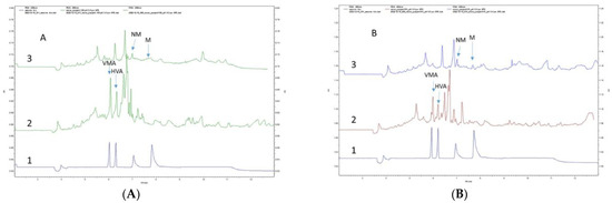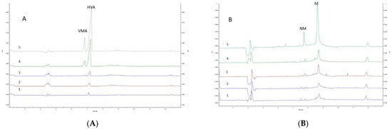 The method’s LODs, LOQs, and precision were also evaluated based on six independent replicate calibration curves. The LOD was defined as the lowest measurable concentration at which the peak height could be calculated as three times the baseline noise; the LOQ was defined as the lowest concentration that could be detected with precision, as expressed by an RSD below 15%; and the method’s accuracy was determined as the percent of analytes detectable at nominal concentrations ranging from 80–120% and with a signal-to-noise ratio greater than 10. The LOD values obtained for HVA, VMA, M, and NM were 0.08 µg/mL, while the LOQ values were 0.25 µg/mL.