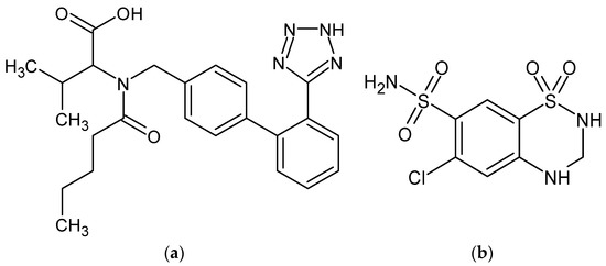Hypertension is the most prominent chronic disease, leading to public-health challenges across the world. If not treated properly, it may lead to concomitant risks of cardiovascular and kidney disease [1]. Globally, 26% of the world’s population are hypertensive, and according to recent data its prevalence is expected to increase to 29% by 2025 [2]. Fixed dose combination (FDC) of diuretics and an angiotensin II receptor antagonist is the best approach for the treatment of hypertension [1,2]. Valsartan (VAL) is an angiotensin II (AT1) receptor antagonist, which is chemically designated as N-(1-oxopentyl)-N-[[2′-(1H-tetrazol-5-yl) [1,1′-biphenyl]-4-yl] methyl]-L-valine (Figure 1a). It is most commonly prescribed and established as an antihypertensive agent, which works by improving cardiac function, endothelial function, and lipid profiles [3]. Hydrochlorothiazide (HCTZ) is a thiazide diuretic, which chemically designated as 6-chloro-3,4-dihydro-2H-1,2,4-benzothiadiazine-7-sulphonamide,1,1-dioxide, which control the blood pressure by inhibiting Na-Cl transport system in the kidney which results to reduces plasma volume (Figure 1b). Long-term treatment with an FDC of VAL and HCTZ effectively reduces blood pressure by improvements in cardiac output, reduction in arterial pressure, and heart rate and reduces cardiovascular risk factors in patients [4].