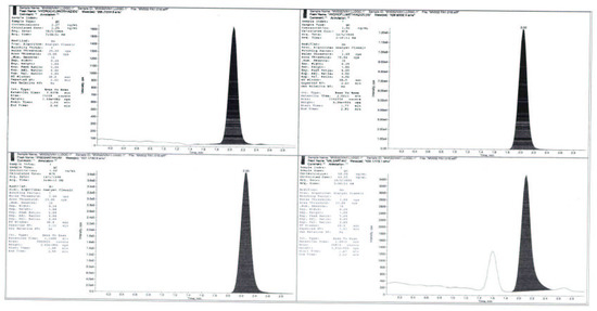 For the six replicate injections of VAL and HCTZ into LLOQ, the mean value ± % CV was 51.52 ng/mL ± 1.57 for VAL and 1.206 ng/mL ± 1.91 for HCTZ, respectively. Therefore, the LLOQ of the analytes, VAL and HCTZ, were fixed at 50.9 and 1.27 ng/mL, respectively. The representative chromatogram of plasma spiked at LLOQ level samples are presented in Figure 3.