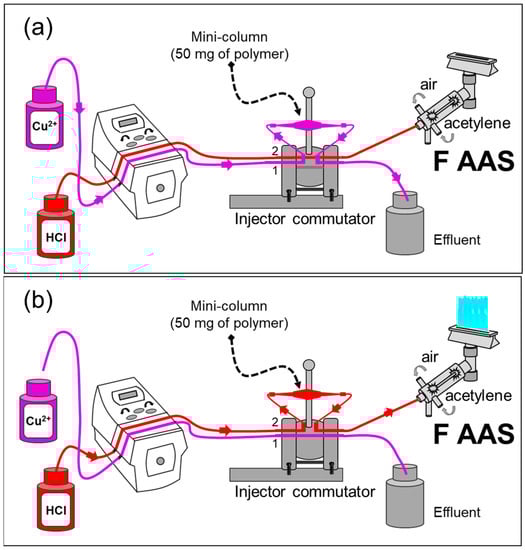 The FIA system was coupled to flame atomic absorption spectrometry (FAAS) (FIA-FAAS) for the on-line copper detection, as can be seen in Figure 1. For the first stage (Figure 1a), a solution containing Cu2+ ions was percolated through the mini-column for 2.14 min at an optimum flow rate of 14.0 mL min−1. The injector was then commuted, and a solution of 0.40 mol L−1 HCl was employed for the elution of Cu2+ from the polymer towards the FAAS detector. This occurred at the same flow rate as the preconcentration step. The signals were recorded as absorbance (Figure 1b).