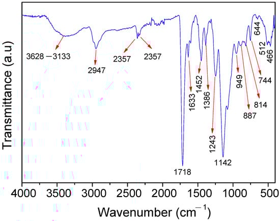 In Figure 2, the band around 3628 and 3133 cm−1 corresponds to the typical O-H and N-H stretching vibration [40,41]. The O-H group is present in the structure of the HEMA and in the physically adsorbed water, which attributes to the hydrophilic properties of the polymer. This, in turn, favors the exclusion of the macromolecules and the retention of the Cu2+ ions on the polymer surface. The N-H bond is present in the 4-PpIX structure. The band at 2947 cm−1 is attributed to the C-H asymmetric stretching of -CH2- and -CH3 from the PpIX, HEMA, and EGDMA [42]. The signals at 2357, 2333, and 644 cm−1 are assigned to the stretching vibration of the O=C-O bond present in the HEMA and EGDMA structures [43], whereas the intense absorption centered at 1718 cm−1 refers to the carbonyl groups’ (-C=O) stretching vibrations from the EGDMA, HEMA, and PpIX. The band at 1633 cm−1 can be attributed to the residual vinyl groups (CH2=CH-, asymmetric stretching) from the PpIX, HEMA, EGDMA, and 4-VP. This band also can be overlapped with the O-H bending vibration of the adsorbed water molecules [44]. The band at 1602 cm−1 corresponds to the C=C stretching and the C=N stretching of the 4-VP and PpIX ring [21,43]. The absorption bands at 1452 and 1386 cm−1 are due to the angular deformation of the -CH3 group [45], while the signals at 1243 and 1142 (band intensity) cm−1 are ascribed to the O-C(O)-C stretching vibration from the PpIX, HEMA, and EGDMA [46]. The bands around 1076, 512, and 466 cm−1 are attributed to the C-N stretching vibration [47]. Bands at 949, 887, 814, and 744 cm−1 refer to the bending out-of-plane (rocking and twisting) of the RCH=CH2 and aromatic hydrogen (Ar-H, rocking) from the PpIX and 4-VP [41].