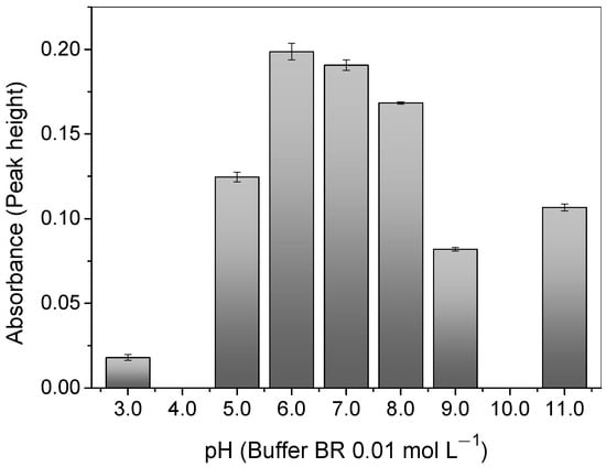 Effect of pH on Cu2+ absorbance signal with a buffer of 0.01 mol L−1 of BR, using the polymer in the FIA system. Conditions: mass of polymer = 50.0 mg; concentration of Cu2+ = 100.0 μg L−1; sample volume = 14.0 mL; preconcentration/elution flow rate = 7.0 mL min−1; eluent = 1.50 mol L−1 HCl.