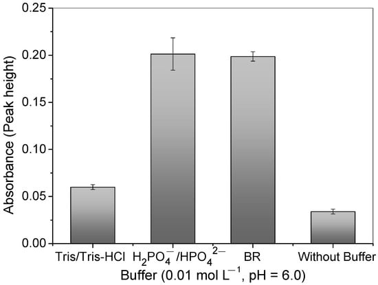 After establishing the optimal pH for copper adsorption, the influence of different types of buffer solutions was investigated. Figure 6 illustrates that the presence of buffer solutions increased the Cu2+ ions’ adsorption, particularly with the H2PO4−/H2PO42− and BR buffers. However, the precision of measurements was lower when using a phosphate buffer. Thus, the BR buffer provided a better buffer capacity and pH stability during the preconcentration step, accentuating the copper charge [Cu(H2O)6]2+ and electroneutrality of the N atom of 4-VP at a pH value of 6.0. In the absence of the buffer solution, it should be stressed that, as the elution was carried out by using 1.50 mol L−1 of HCl, residual acid existed in the mini-column; this significantly decreases the pH of the sample without using a buffer solution.