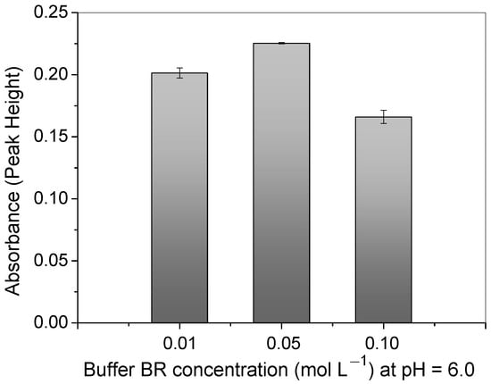 Regarding the BR buffer concentration in the solution, the difference in the absorbance signal between 0.01 and 0.05 mol L−1 was approximately 10.6 %, as can be observed in Figure 7. This confirms that the buffering capacity was better when higher concentrations of buffer were used. Thus, a concentration of 0.05 mol L−1 was selected for further experiments in this work. The analytical signal greatly decreased above the concentration of 0.05 mol L−1. This was most likely due to the great number of molecules which might interact with the copper ions and the surface of the polymer, hindering the adsorption process.