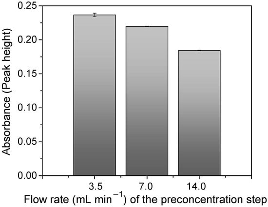 The flow rate in the FIA-FAAS system is a very important parameter to optimize when kinetics exerts an effect on adsorption. As is illustrated in Figure 8, the adsorption increased with the lowest flow rate (3.5 mL min−1), suggesting a slow kinetic for the mass transfer of Cu2+ ions toward the polymer surface. Thus, the slower the flow rate, the longer the contact time (4 min) and the Cu2+–polymer interaction.