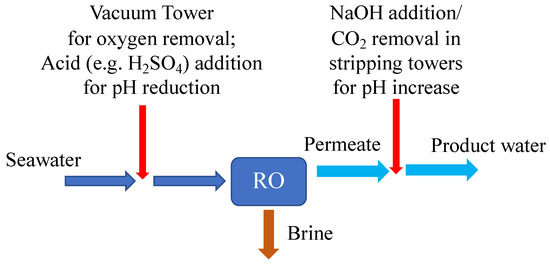 Desalination is today one of the major sources of fresh water, a response to the water scarcity which afflicts the planet. Plants based on reverse osmosis (RO) are quickly replacing thermal plants, due to the lower energy consumption. In RO, the semipermeable membrane is able to be permeated at ambient temperature mostly by water, while the dissolved species are blocked at the retentate side. Starting from seawater, two streams are then produced: the permeate fresh water, which is depleted of most of the elements (including monovalent ions); and the rejected brine, which is concentrated in the elements contained in the seawater. Because of the osmotic limitations, water-recovery factors not exceeding 50% can be obtained. Both pre-treatments and post-treatments are required in RO plants. Pre-treatments are needed to reduce fouling issues in RO modules, as well as to control the oxygen content and the pH of the seawater. In particular, the oxygen content has to be controlled to avoid problems of corrosion, oxidation processes, and biogrowth. Also, the pH must be adjusted to match the requirements of the pre-treatment methods employed, as well as those of the RO membrane, and to control the precipitation of species, which could lead to scaling problems in the plant. Similarly, during post-treatments, in addition to the remineralization of the permeate, the pH of the product water must be at the target value [1]. The oxygen removal is usually carried out in vacuum towers, eventually coupled with oxygen scavengers, while the pH control is often obtained by adding acids (e.g., H2SO4 is often employed when coagulation is used as RO pre-treatment) and bases (e.g., NaOH). Sometimes the pH increase is also obtained by CO2 stripping. Concerning the brine produced, no specific treatments are employed, as it is discharged back to the sea, injected into deep wells, sent into sewers, or collected in solar ponds. However, these common practices cause serious impacts on the environment and disturbance of the marine ecosystem [2,3,4,5]. Figure 1 shows the conventional pre- and post- treatments used to control the pH and the oxygen content in an RO desalination plant.