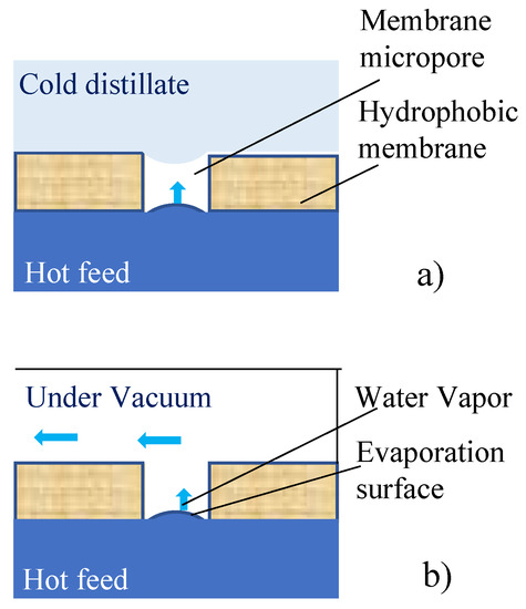 Since their first appearance, dating back to early 1990s, membrane contactors have been applied in different fields, including the carbonation of beverages, treatment of boiler feedwater (deoxygenation), ultrapure water production for the semiconductor industry, blood oxygenators, extraction of acidic gases from flue gases, extraction of metals from contaminated wastewaters, etc. [6,7]. In MCs, microporous membranes are not used for their selective properties, but for providing an interface between phases. Once the phases are in contact at the micropore mouth, the species can move from one phase to the other by diffusion, with the driving force being the difference in concentration. MCs are characterized by a high interfacial area, which leads to very compact devices. When compared with vacuum towers for the oxygen removal from seawater, MCs working with a combination of stripping gas and vacuum (combo mode) show a higher removal efficiency, a lower weight and a smaller footprint, a lower cost for maintenance (chemicals are not required), and a greater modularity [8,9,10]. Membrane distillation (MD) is another membrane operation belonging to the MCs family. Microporous hydrophobic membranes are used to evaporate a hot feed (typically from 40 °C to 80 °C), preventing the passage of water as liquid. Therefore, at the permeate side, a high-purity water (distillate) is collected, while all non-volatile species are concentrated on the feed side. The driving force is a difference in vapor pressure across the membrane, which can be obtained in different ways, depending on the MD configuration. In the Direct Contact Membrane Distillation, a cold stream (distillate), in which the vapor condenses, is sent at the other side of the membrane, while in Vacuum Membrane Distillation, the permeate is kept under vacuum and the vapor condenses outside the MD module. Figure 2 shows the vapor removal from the hot feed through the membrane micropore, for the two MD configurations.