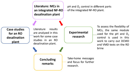 With respect to RO, MD can also be used with high feed concentrations, being affected to a minor extent by concentration-polarization phenomena while not suffering from osmotic limitations. Based on this feature, different studies have been carried out to further concentrate the RO brine by MD, so as to produce more fresh water and to reduce the brine volume to be disposed. In particular, different MD configurations have been investigated using different modules, membranes and operating conditions [11,12,13,14,15,16,17,18,19,20,21,22]. Considering the state of the art in the field, MCs could play an interesting role in RO desalination plants. This work is intended to further assess and extend the application of MCs in the pre-treatment and post-treatment lines, highlighting their flexibility, which is an important aspect in the plant design. In a previous study, MCs were experimentally investigated to control both the oxygen removal and the pH in different points of an integrated nanofiltration (NF)-RO desalination plant (NF feed, NF permeate, RO brine and RO permeate), resulting in a possible option to reduce the use of chemicals [23]. Hydrophobic membranes were employed to block the liquid phase at the pore mouth, while allowing the permeation of the gaseous phase inside the pore. The obtained outcomes are now considered in some case studies regarding the seawater pre-treatment and the permeate post-treatment of an RO plant, so as to investigate whether MCs can have a role in reaching the target values of a real RO desalination plant. The pre-treatment considered consists of the use of MCs for the oxygen removal coupled with the pH reduction of seawater (see Figure 3a), while the post-treatment focuses on the pH increase of the produced water (see Figure 3b). To the best of the Author’s knowledge, no other data are available in literature on the application of membrane contactors for the simultaneous control of the oxygen content and pH, as well as for the pH adjustment, in desalination. Furthermore, to highlight the flexibility of MCs, the same module used for the gas-liquid operation is employed to carry out MD tests on the RO brine. In particular, the performance of DCMD and VMD for treating the RO brine are compared in terms of flux and permeate conductivity. The possibility of having a versatile module for different processes makes plant design easier and cheaper. Moreover, the use of the same module, membrane and operating conditions for the RO brine treatment, allows a direct comparison of the MD configurations performance, not often possible when based on literature studies, because of the different modules, membranes, operating conditions and MD configurations investigated. Figure 4 summarizes the main steps followed in this work.