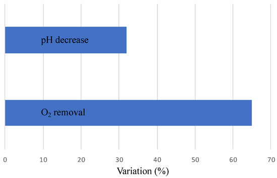 If gas-liquid MCs are applied, it is possible to couple the oxygen removal with the pH reduction in the same device, by sending carbon dioxide in the gas phase. Figure 7 shows the maximum variations registered in [23] for seawater.