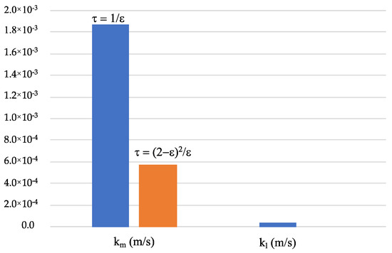 A maximum pH reduction of 32% was obtained for seawater (from 7.83 to 5.32). Therefore, gas-liquid MCs can be used to decrease the seawater pH down to 7, as required, by simply acting on the operating time. Concerning the oxygen removal, a maximum of 65% oxygen removal was obtained, while higher values (around 99.7%) are needed to meet the specification. As reported in Section 2.1.2., the transport of gaseous species in the membrane contactor mainly depends on the mass transfer coefficients of the liquid and of the membrane. This means that variations at the gas side (e.g., an increase of the gas flow rate) would lead to improvement of the removal efficiency less than acting on the liquid side or on the membrane properties would. By applying the equations reported in Section 2.1.2, both mass transfer coefficients were calculated, to theoretically analyze the obtained result. In particular, for the membrane used in [23], which gave the values reported in Figure 7, only the membrane pore size (nominal diameter of 0.2 μm) and the thickness (202 μm) were known. Therefore, calculations were made by varying the porosity of the membrane from 20% to 80% and by using both formulae available to obtain the tortuosity. Figure 8 shows the trend of the mass transfer coefficient of the membrane over the porosity. In both cases, an increase of the membrane porosity leads to an increase of km, because of the higher area available for the transport. This is more evident for the case of a more open structure of the membrane. However, the mass-transfer coefficient of the membrane is always much higher than that of the liquid phase, as shown in Figure 9, where the lowest km values are compared with the calculated kl.