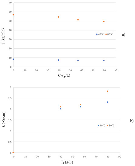 By comparing the results obtained at the two temperatures for the 80 g/L feed, the increase of flux registered at 80 °C was significantly higher than the related increase of the permeate conductivity. This means that a higher amount of fresh water can be obtained. However, higher temperatures also imply higher thermal energy demand, and a trade-off must be reached. When waste heat or renewable energies (e.g., solar) are available and appropriate pre-treatments are conceived, the use of high temperatures in DCMD allows increase in the productivity of the process and, then, of the RO desalination plant.