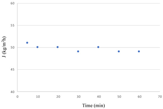 The behavior of the flux with time is reported in Figure 11. In the first 30 min of operation, a slight decline in flux was registered, then, in the remaining time of the test, the flux was quite stable.