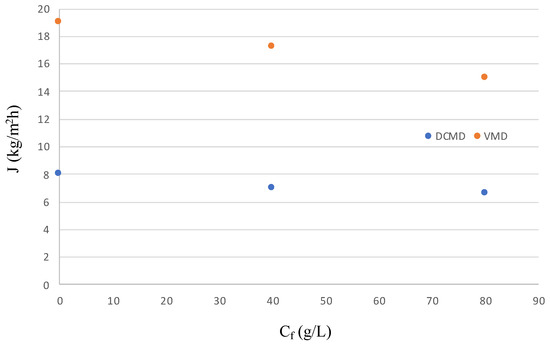 Similar tests were performed with the VMD configuration. Figure 12 summarizes the trend of the flux at 40 °C and 60 °C and as a function of the feed concentration. Also in this case, there was a reduction of flux with the increase of the feed concentration, and higher fluxes were obtained at higher temperatures due to the higher driving forces. Yet interesting flux values were already obtained at 40 °C. In fact, if we compare the DCMD and VMD configuration at parity of feed temperature, a significant difference in flux is registered, despite applying the same driving force (Figure 13). The two MD configurations operate in the same conditions at the feed side, so this difference in performance can be linked to different conditions established at the permeate side. In particular, while 20 mbar was the effective pressure at the permeate side in VMD, the vapor pressure at the membrane-distillate side can be higher than that of the bulk, due to temperature polarization, with a consequent decrease of the effective driving force in DCMD.