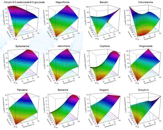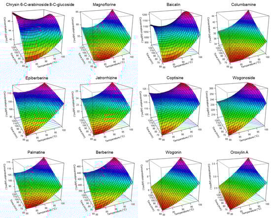Response surface plots for the twelve marker compounds in S. baicalensis and C. chinensis single paired extract at various extraction temperatures and times. Color red is the lowest condition while color purple is the highest condition of parameters in 3D plot.