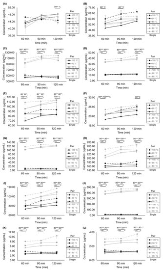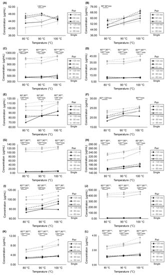 Tukey’s test was used to compare differences in marker compound concentrations between the paired and single extracts, as well as between different extraction conditions (temperatures and times) in each of the paired or single extracts, with significance set at p < 0.05, p < 0.01, and p < 0.001.