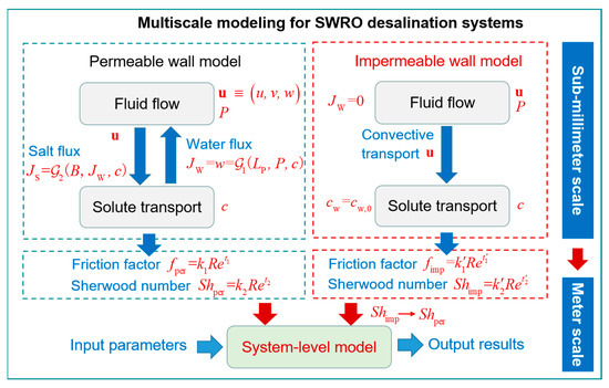 The multiscale modeling framework for SWRO desalination that integrates the permeable wall model and the impermeable wall model.