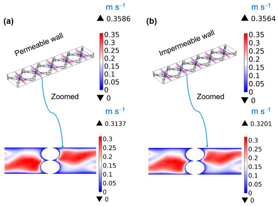 The velocity magnitude distributions with an inlet average velocity magnitude of 0.15 m s−1 using (a) the permeable wall model (Case 1: = 1 L m−2 h−1 bar−1) and (b) the impermeable wall model.