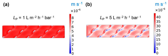 The water flux with inlet average velocity magnitude of 0.15 m s−1 using the permeable wall model for (a) the commercial membrane ( = 1 L m−2 h−1 bar−1) and (b) the HPM ( = 5 L m−2 h−1 bar−1) systems.