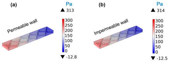 The pressure magnitude distributions with an inlet average velocity magnitude of 0.15 m s−1 using (a) the permeable wall model and (b) the impermeable wall model.