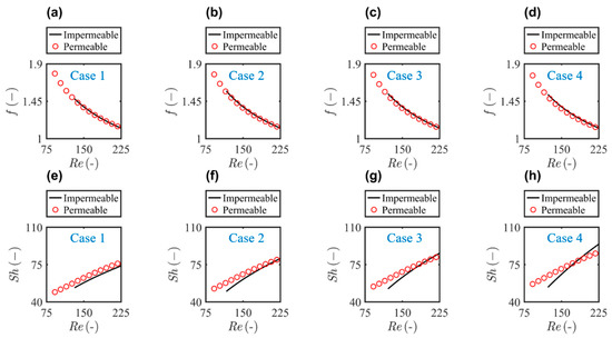 The friction coefficient () and and Sherwood number () with respect to various Reynolds numbers (Re) using the impermeable wall model and the permeable wall model for Case 1 (a,e) ( = 1 L m−2 h−1 bar−1), (b,f) Case 2 ( = 3 L m−2 h−1 bar−1), (c,g) Case 3 ( = 5 L m−2 h−1 bar−1) and (d,h) Case 4 ( = 10 L m−2 h−1 bar−1).