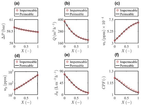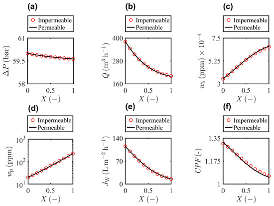 The simulated results at the system level using the impermeable and permeable wall models with the feed salinity ( = 35,000 ppm), water recovery ( = 50%), pump efficiency (0.85), energy recovery device efficiency (0.95) and water permeability ( = 10 L m−2 h−1 bar−1). (a) Transmembrane pressure, (bar), (b) Flow rate, ( m3 h−1), (c) Brine salinity, (ppm), (d) Permeate salinity, (ppm), (e) Permeation flux of water, (L m−2 h−1), (f) CP factor, (−) along the dimensionless length ().