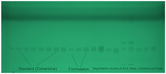 A typical, thin-layer chromatography (TLC) chromoplate of the standard CIN, formulations, and forced degradation samples derived from an eco-friendly EtOH-H2O (90:10 v/v) mobile phase for the current approach.