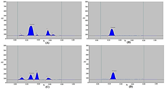 The selectivity/degradation of the present approach was evaluated using four different stress settings. The results are displayed in Figure 5 and Table 6. In the chromatograms from the degradation scenario, the CIN peak was clearly distinguishable from the other peaks of degradation products (Figure 5). During the acidic degradation test, CIN remained at 66.40%, while 33.60% was decomposed (Table 6 and Figure 5A). As a result, CIN was found to be sufficiently unstable under acidic degradation conditions. Chromatographic peaks 1, 3, 4, and 5 in Figure 5A, which represent the acid-induced degradation peaks, were separated by Rf values of 0.11, 0.38, 0.56, and 0.65, respectively. During the acidic degradation test, CIN’s Rf value was unchanged (Rf = 0.27). As 100% of the CIN was left after the alkaline and thermal degradation tests, no CIN was degraded under alkaline and thermal stress conditions (Table 6 and Figure 5B,D). As a result, CIN was found to be highly stable under alkaline and thermal stress conditions. During the alkaline degradation tests, the CIN’s Rf value was slightly shifted (Rf = 0.26). However, during the thermal degradation tests, the CIN’s Rf value was remained the same (Rf = 0.27). During the oxidative degradation test, CIN remained at 32.68%, while 67.32% was decomposed (Table 6 and Figure 5C). As a result, CIN was found to be highly unstable under oxidative conditions. Chromatographic peaks 1, 3, and 4 in Figure 5C, which represent the oxidative degradation peaks, were separated by Rf values of 0.12, 0.38, and 0.56, respectively. Under oxidative degradation conditions, the CIN’s Rf value was also unchanged (Rf = 0.27). Using the current approach, the maximum CIN decomposition was found during the oxidative degradation test. These outcomes suggest that CIN can be measured using the present approach in the presence of its decomposition compounds. These results show that the current approach has selectivity and a stability-indicating property.