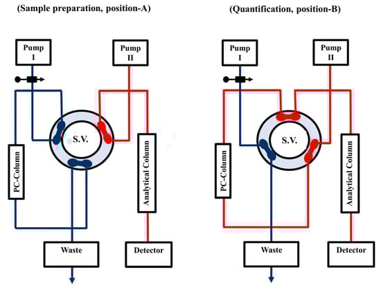 Figure 1 represents a back flushed (BF) direct sample injection (DSI) bio-analytical HPLC-based manifold (BA-HPLC) with UV detection (BF-DSI-BA-HPLC-UV). This manifold comprises two pumps (Agilent 1100 Series Iso pump G1310A, Agilent Technologies, Santa Clara, CA, USA); one is used to load serum samples onto the PC-pre-column (laboratory prepared) of ODS silica (PC-ODS-pre-column) (20 mm × 4.6 mm i.d., 20 µm particle size) [32] in the extraction position, and the other is used to flush carbamazepine from the PC-ODS-pre-column to the analytical column of ZORBAX Eclipse XDB-C18 (15 cm × 0.46 cm i.d. (5 µm particle size)) in a BF mode for the quantification purpose. An injector, model 7725i (with a 100-µL loop), and a flow switching high-pressure valve, model 7000, (Rheodyne, Berkeley, CA, USA) were utilized to load samples and facilitate the flushing of carbamazepine from the extraction position onto the quantification position at a flow rate of 1 mL/min. To monitor carbamazepine at 230 nm, a model Agilent 1100 Series VWD G1314A UV/Vis detector was employed. Software from Agilent, LC ChemStation, was used for data collecting. All experiments were conducted at (21 ± 1 °C).