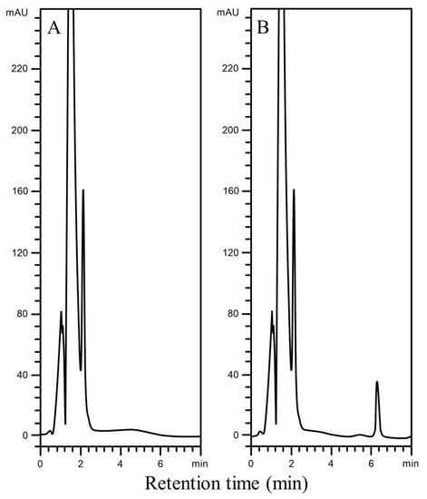 By comparing five different samples of blank serum and blank serum spiked with carbamazepine (8000 ng/mL), the selectivity of the current method was evaluated. The high selectivity of the BF-DSI-BA-HPLC-UV methodology is demonstrated by the lack of endogenous matrix interferences at or close to the carbamazepine detected peak (Figure 2A,B).