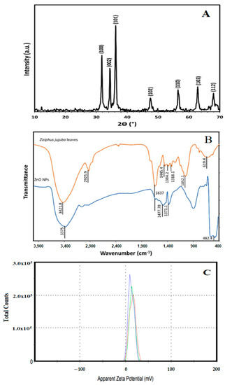 X-ray diffraction pattern of green biosynthesized ZnO NPs (A), FT-IR spectra of Ziziphus jujuba leaves extract and green biosynthesized ZnO NPs (B), and the zeta potential measurement of the green biosynthesized ZnO NPs (C).