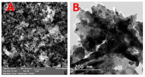 Scanning Electron Microscope (A) and transmission Electron Microscope (B) micrographs of ZnO NPs.