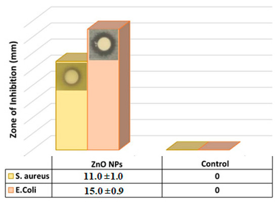 Inhibition Zone produced by green biosynthesized ZnO NPs against S. aureus and E. coli bacteria (the reported values are average and based on four measurements).