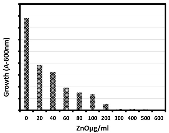 Growth of bacteria (E. coli) exposed to various concentrations of ZnO NPs (20–600 μg/mL).