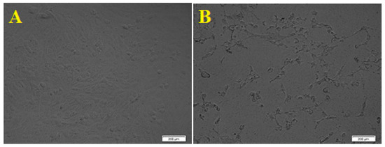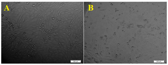 Morphological changes of HepG2 cell line due to the cytotoxicity effect of ZnO NPs. (A). Control. (B). Morphological changes in the cell after 24 h. Scale bars = 200 µm.
