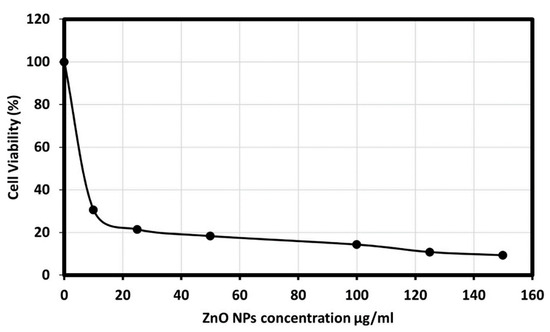 The cytotoxicity effect of ZnO nanoparticles on the HepG2 (human liver cancer) cells was explored; as liver cancer is a significant health problem worldwide [55]. Viability and apoptosis of the cell in the presence of NPs were analyzed by using a cell counting kit-8 (CCK8) assay. The biosynthesized ZnO NPs showed an excellent cytotoxic effect on the HepG2 cell line, as the morphology of the HepG2 cells was changed. Figure 8 presents the dose-dependent behavior by using different concentrations of ZnO NPs from 10, 25, 50, 100, 125, and 150 μg/mL. The results showed a significant reduction in cell viability subsequent treatment with 10 to 50 µg/mL. However, significant differences in cell viability were observed between 100 and 125 µg/mL, and Figure 9 showed the graphical representation of the morphological changes due to the effect of ZnO nanoparticles on cancer cells. It is noteworthy to mention that the cytotoxicity of ZnO NPs was high on HepG2 cells compared with HCT-116 cells.