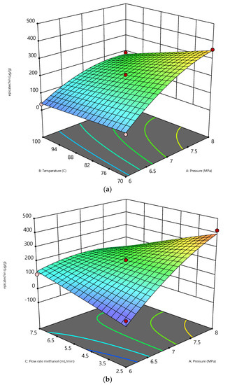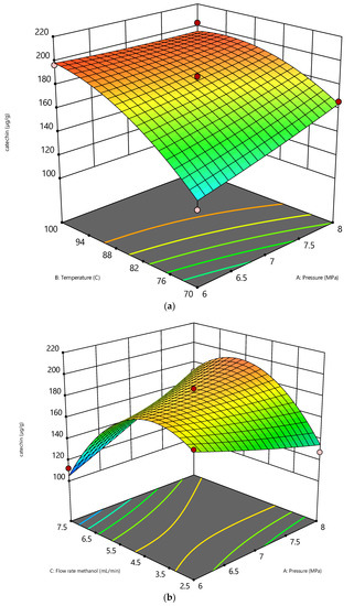 A Box–Behnken design was formulated by “Design Expert” software (13.0.4, Minneapolis, MN, USA) to analyze the effects of variables. The pressure, temperature and flow rate were studied, as well as catechin and epicatechin as the responses. The second order was applied to correlate the data as follows: