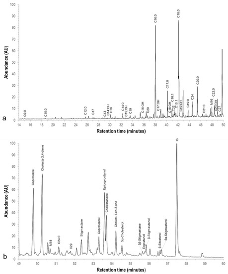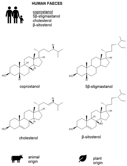 - Bull, I.D.; Lockheart, M.J.; Elhmmali, M.M.; Roberts, D.J.; Evershed, R.P. The origin of faeces by means of biomarker detection. Environ. Int. 2002, 27, 647–654. [Google Scholar] [CrossRef] [PubMed]