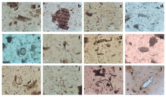 - Brinkkemper, O.; van Haaster, H. Eggs of intestinal parasites whipworm (Trichuris) and mawworm (Ascaris): Non-pollen palynomorphs in archaeological samples. Rev. Palaeobot. Palynol. 2012, 186, 16–21. [Google Scholar] [CrossRef]