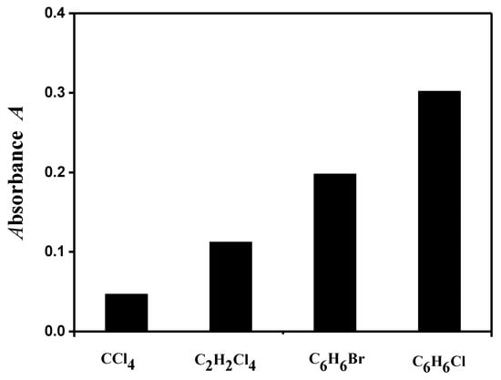 It was found that a stable cloudy solution was formed when each of CCl4, C2H2Cl4, C6H5Cl, and C6H5Br was employed, while an unstable cloudy solution was formed and the sediment phase at the bottom of the centrifuge tube after centrifugation was difficult to remove by microsyringe when each of C2H4Cl2 and C2Cl4 was used. In addition, it can be seen in Figure 1 that the maximum absorbance was obtained by using C6H5Cl as the extraction solvent. Therefore, C6H5Cl, with the highest extraction efficiency, was selected as the best solvent for further experiments.