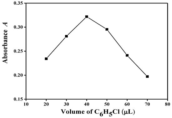 The volume of extraction solvent is an essential factor that affects the extraction efficiency in the DLLME procedure. In order to evaluate the optimal volume of extraction solvent, the influence of the volume of C6H5Cl on the extraction efficiency of Cu(II) was studied in the range of 20–70 μL with the same DLLME procedures. Figure 2 illustrates the variations of the extraction efficiency versus the volume of the extraction solvent. As can be seen, the absorbance of Cu(II) increased with the increase in C6H5Cl volume from 20 μL to 40 μL and then decreased with a further increase in C6H5Cl volume. The initial absorbance increase is due to the enhancement of the dissolving capacity of copper chelate. However, when the volume of C6H5Cl is higher than 40 μL, the absorbance begins to decrease significantly with increasing volume of C6H5Cl because of the sample dilution. Therefore, 40 μL of C6H5Cl solution was employed for the subsequent experiments.