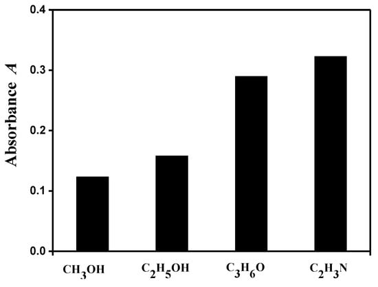 The type of disperser solvent is another essential factor that affects the extraction efficiency in DLLME. The dispersive solvent should be miscible with both the aqueous phase (sample solution) and the organic phase (extraction solvent), and it can significantly decrease the interfacial tension between water and the extracting solvent and thus make the droplet size smaller. Therefore, methanol (CH3OH), ethanol (C2H5OH), acetone (C3H6O), and acetonitrile (C2H3N), which possess these abilities, were examined as potential dispersive solvents. The influence of the abovementioned solvents on the extraction efficiency of Cu(II) was studied using 500 μL of each solvent together with 40 μL of C6H5Cl as the extraction solvent. As can be seen in Figure 3, the highest absorbance signal response of Cu(II) was obtained when C2H3N was used as the disperser solvent. Hence, C2H3N was selected as a disperser solvent for subsequent experiments.