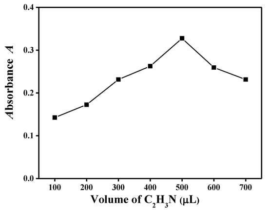 The effect of the volume of disperser solvent CH3CN on the extraction efficiency of Cu(II) was also investigated in the range of 100~700 μL of CH3CN together with 40 μL of C6H5Cl. As shown in Figure 4, the highest absorbance signal of Cu(II) was attainable using 500 µL of CH3CN. At a lower volume, CH3CN could not disperse C6H5Cl effectively and the cloudy solution was not formed completely. Reversely, at a higher CH3CN volume, the solubility of the copper chelate in water increased with the increase in the volume of CH3CN. Therefore, 500 µL of acetonitrile was selected as the optimum disperser volume.