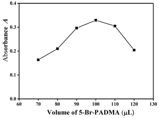 A laboratory-synthesized [30] chelating agent 2-(5-bromo-2-pyridylazo)-5-dimethylaminoaniline (5-Br-PADMA) was selected to form a hydrophobic chelate with Cu(II) because 5-Br-PADMA was found to be a good chromogenic reagent for spectrophotometric determination of copper,. The effect of the amount of 5-Br-PADAM on the extraction efficiency of Cu(II) was evaluated in the range of 70–120 µL. As can be seen in Figure 5, the absorbance of Cu(II) was increased with the increasing amount of 5-Br-PADAM up to the maximum value at a volume of 100 µL of 5-Br-PADAM. However, a further increase in 5-Br-PADAT volume resulted in a decrease in the analytical signal of Cu(II) due to the extraction of excess 5-Br-PADAM, which in turn decreased the limited capacity of the organic solvent for the quantitative extraction of the Cu(II)-5-Br-PADAM chelate. Hence, 100 μL of 5.0 × 10−4 5-Br-PADAM solution was employed for subsequent experiments.