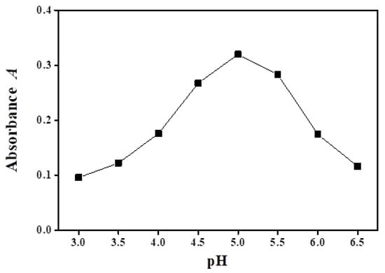 In the experiment, 5-Br-PADAM was chosen as the chelating agent. As shown in Scheme 1, 5-Br-PADAM molecule contains three nitrogen atoms including two amino group nitrogen atoms and a ring nitrogen atom, and its copper chelate also has uncoordinated nitrogen atoms, which can combine with protons. Therefore, the pH value of the test solution affects not only the formation but also the hydrophobicity of the Cu(II)-5-Br-PADMA chelate and is one of the most important factors. The influence of pH on the DLLME extraction of Cu(II) was studied in the pH range of 3.0–6.5. As shown in Figure 6, the high absorbance of Cu(II) was observed at pH 5.0. Hence, a pH of 5.0 was employed for the subsequent experiments.